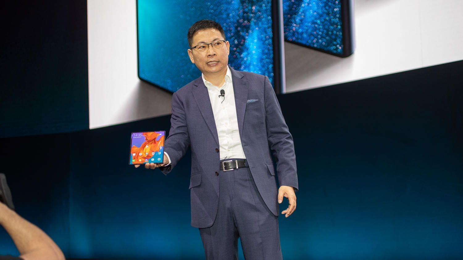 MWC2019,华为展台,工作人员进行折叠展示 每经记者 刘春山 摄