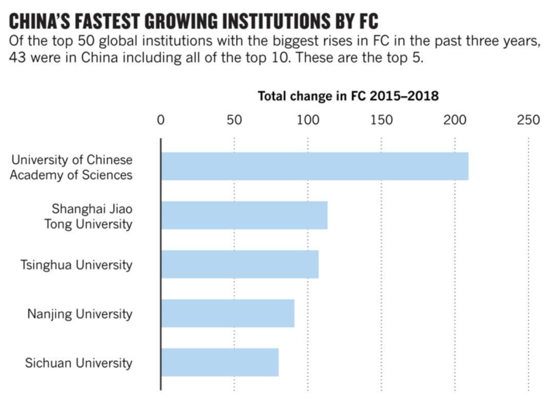 在过去三年里FC得分上升最多的全球50大机构中,42个是中国机构。