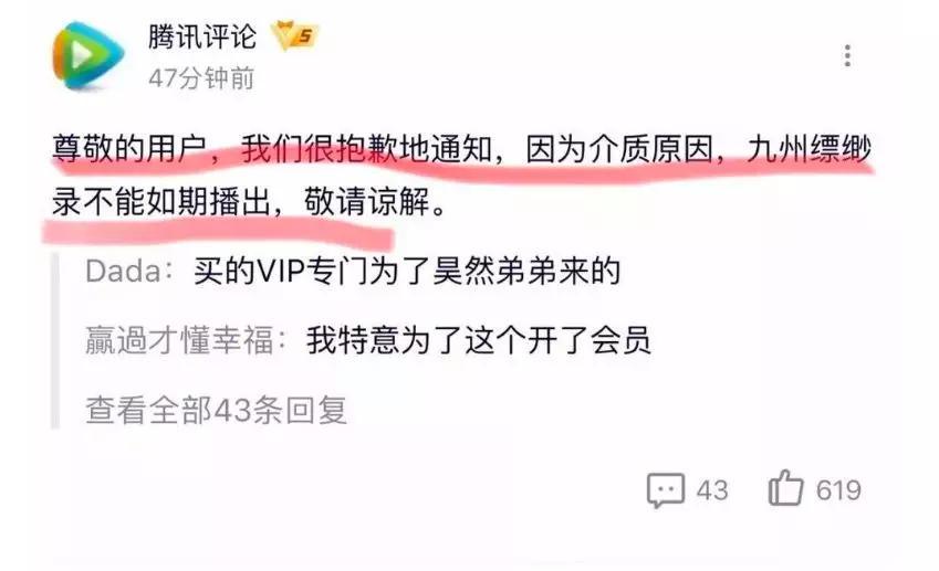 在播前半个小时,仍没有任何一方给出解释, 直到21点41分(开播前20分钟),腾讯视频在《九州缥缈录》预告片留言区发表评论:“尊敬的用户,我们很抱歉地通知,因为介质原因,《九州缥缈录》不能如期播出,敬请谅解。”