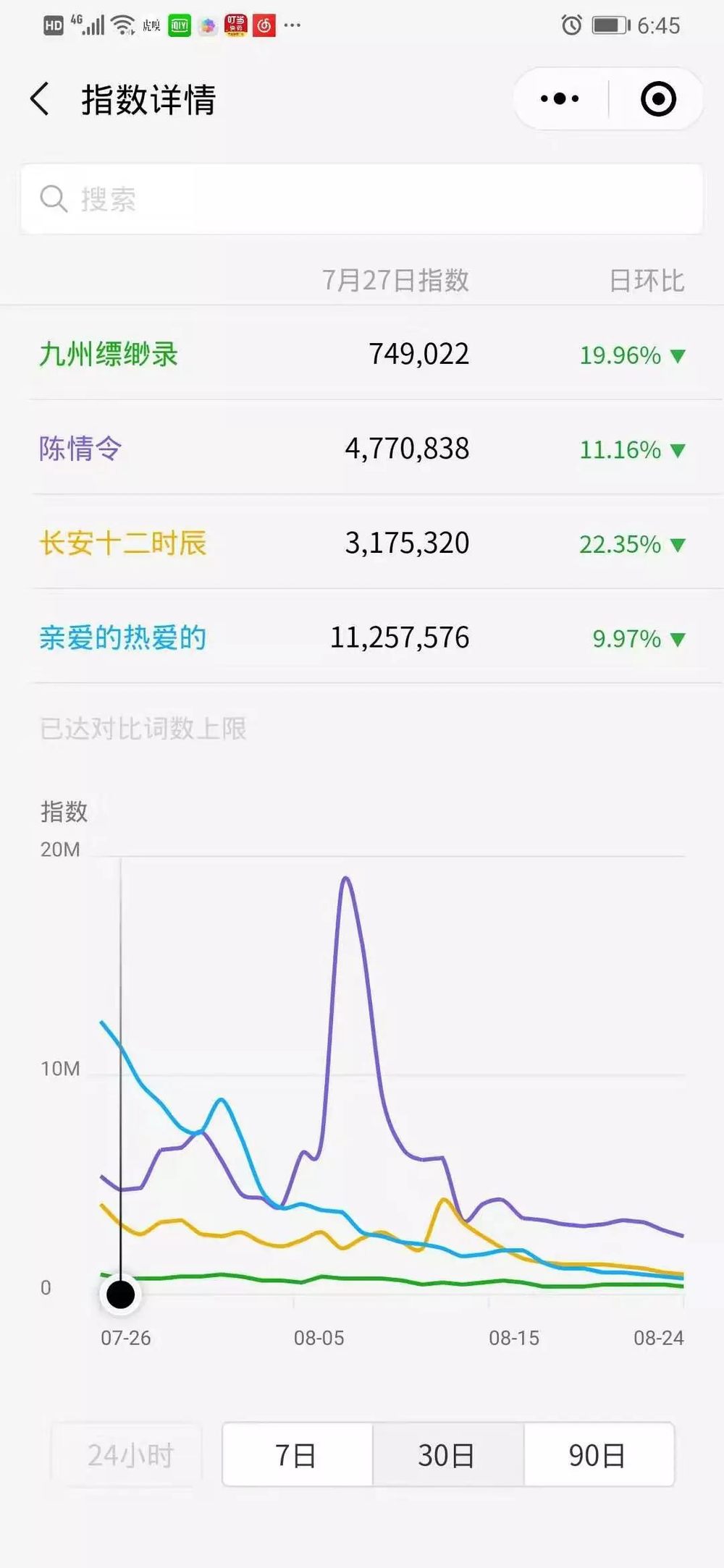 从同期剧微信指数来看,《九州》就更相形见绌了。微信指数显示,同期剧中,《陈情令》《长安十二时辰》《亲爱的,热爱的》《九州》四部显示出完全不同的热度走势,《亲爱的,热爱的》和《陈情令》都出现过非常明显的话题波峰,平均曲线也大过《长安》和《九州》这两部古装巨制,《九州》则一直处于非常低的水平线,自始至终没有过明显波动,且在“平缓”中下滑。
