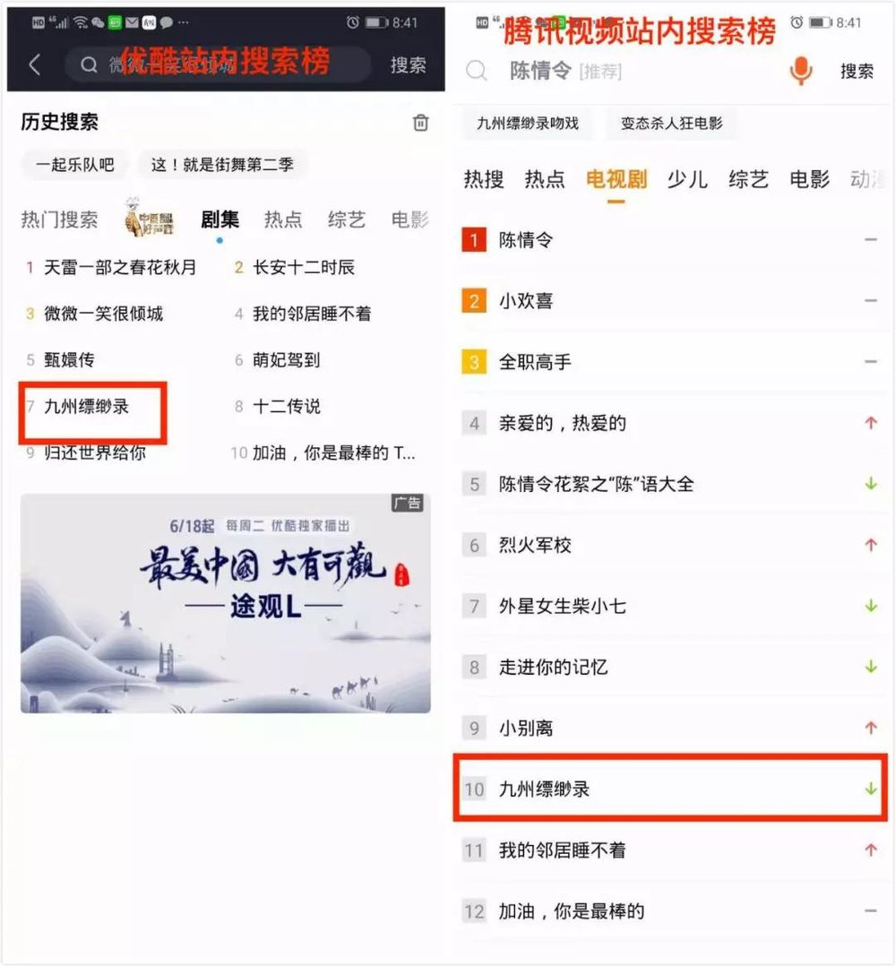事实上,在最早定档的6月3日前,两大视频网站的battle就相当有趣。优酷和腾讯视频作为《九州缥缈录》的版权方,使劲了浑身解数,拼命安利自己平台还有《九州缥缈录》,让画面着实有点搞笑。为了宣传,优酷这边说“《九州缥缈录》在优酷”,腾讯这边说“上腾讯视频看《九州缥缈录》”。