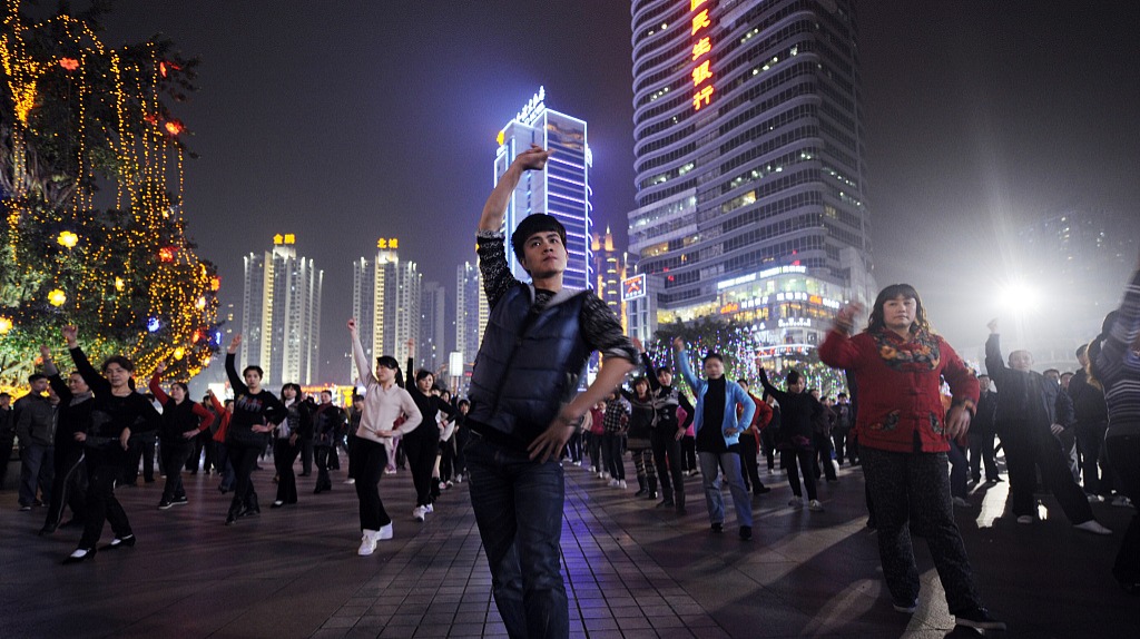 在观音桥跳《小苹果》广场舞的重庆居民,红鼎国际也在这个商圈。图片来源:视觉中国