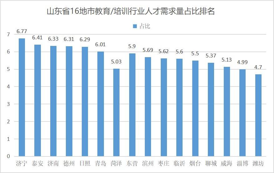 其中,作为儒学圣地重教育,济宁(备注:济宁包含曲阜)成教育/培训行业需求占比最大城市。从山东省16地市教育/培训行业人才需求量占比排名来看,济宁教育/培训行业的人才需求比重排名第一,人才需求占城市总需求的6.77%;其次是泰安,占城市总需求的6.41%;济南排名第三,比重为6.33%;淄博和潍坊的教育/培训行业人才需求占比相对较低,分别为4.99%和4.7%。