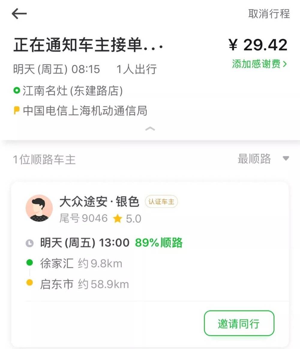 施先生是一位开了两年顺风车的司机,他接单有偏好,单程在30公里以上,最好的跨城单。“同一时间很少有完全匹配的乘客,短途的话会降低顺路程度,跨城长途对司机和乘客来说是双赢的。”他说道。