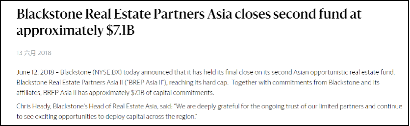 黑石于2018年成功募集第二只亚洲机会型房地产基金(BREP Asia II),募资总额高达 71亿美元