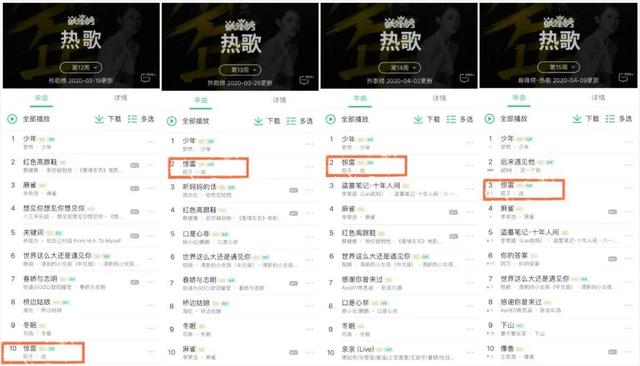 3月19日,阳子的《惊雷》正式登陆QQ音乐热歌巅峰榜第十名,并在接下来的四周内横踞榜单前三,于此同时倪浩毅的《惊雷》也登陆第十四周QQ音乐网络歌曲榜前十。在短视频使用量上,截止到4月13日,快手超过10万人使用的《惊雷》片段高于10个,其中最高使用量为101.3万;而在抖音上,#惊雷#有42.9亿次播放量、15.1万个视频,#挑战唱惊雷#有18.5亿次播放量、3.4万个视频。