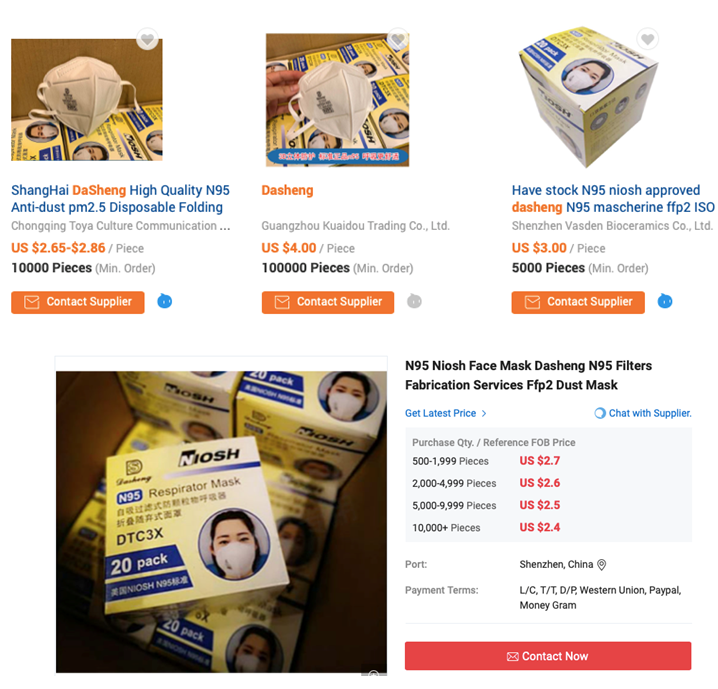 而这些终端的价格也远远超过了贸易报价。据阿里巴巴网站报价,1万以上的大胜口罩最低在2.65~2.86美元之间,另一家外贸网站显示,5000~10000的报价在2.5美元/个,1万以上在2.4美元/个。