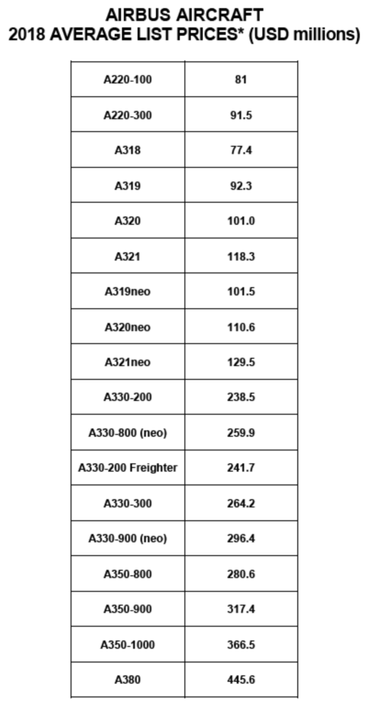 这是空客今年一季度交付数据,下表则是2018年各机型目录价格: