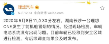 “一台理想ONE发生了前机舱冒烟的情况,经过现场检测,车辆电池系统没有出现问题。”
