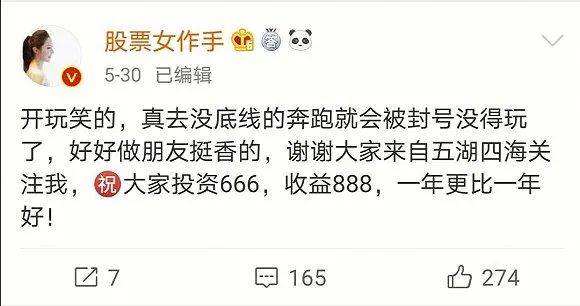 还有典型博眼球式。此前微博财经大V“股票女作手”曾公开表示沪指不到3000点就裸奔,在圈内传得沸沸扬扬。这场闹剧最终以沪指未能如期突破3000点,“股票女作手”回应只是开玩笑、裸奔违法收场。