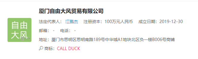 在企查查、天眼查综合搜索“来玩鸭”和“CALL DUCK”,显示商标所属公司为厦门自由大风贸易有限公司,2019年年末才成立,注册资金为100万元,地址位于厦门思明区。