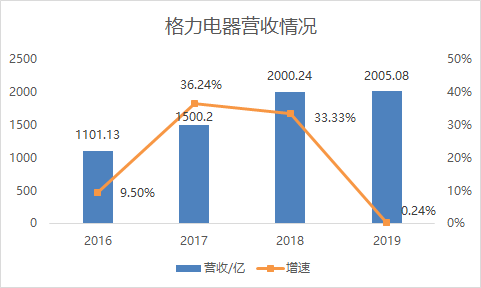 这正是格力的问题,截至目前,格力仍然只有空调这一张牌。2019年,格力电器仍以空调为主要核心产品,全年空调产品实现营业收入为1386.65亿元,占公司总营业收入的69.99%。