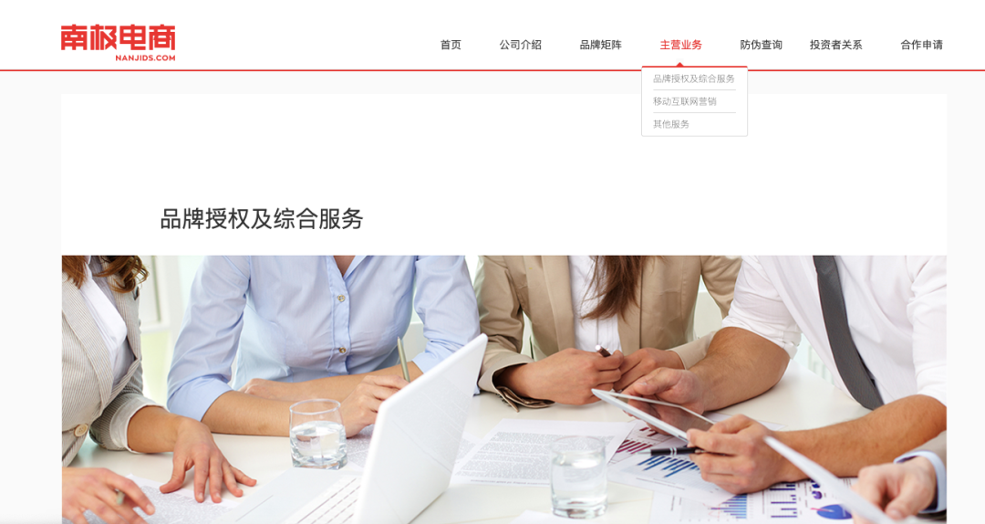 打开南极电商的官网,在主营业务一栏,只能看到空荡荡的「品牌授权及综合服务」、「移动互联网营销」和「其他服务」。「其他服务」则包括「保理业务」、「自媒体流量变现」以及标注了「该业务是公司逐步收缩的业务」的「园区平台服务」和「货品销售」。