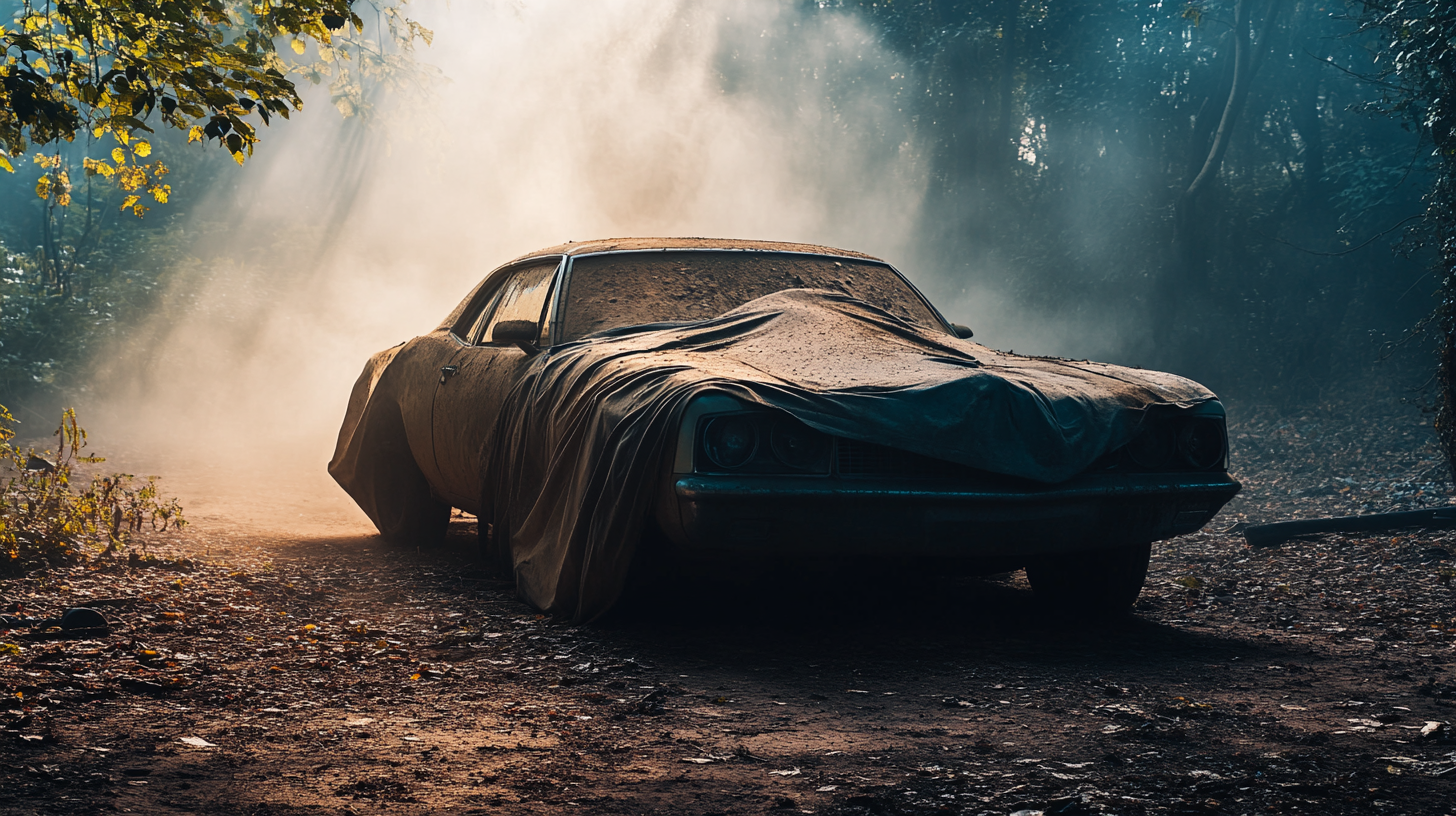 这些车的车衣上铺满厚厚的一层灰尘、落叶和鸟粪,一旦被轻轻掀起,车衣脆得片片滑落,露出一辆不旧也不新的车。