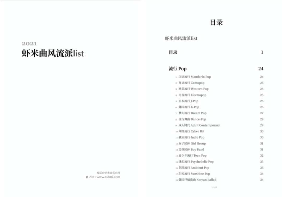 这不失为虾米的客观评价。虾米用户在虾米关停前梳理出了一份《2021虾米音乐曲风流派list》,这份PDF一共436页,涵盖流行、摇滚、爵士等24个一级分类和548二级分类,每个分类下都有非常详细的科普介绍。