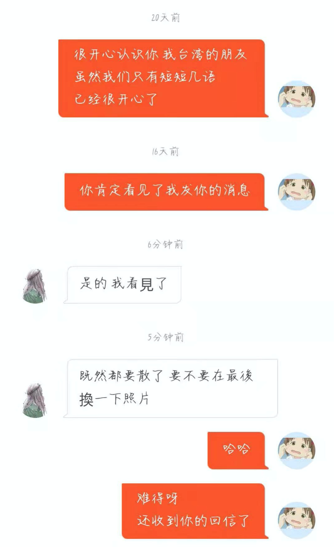 在看到虾米关闭的消息后,小步给台湾“笔友”发私信告别,“虽然只有短短几语,但认识你很开心”。20天后,小布收到了对方在虾米的回复,“既然都要散了,要不要在最后交换一下照片”。