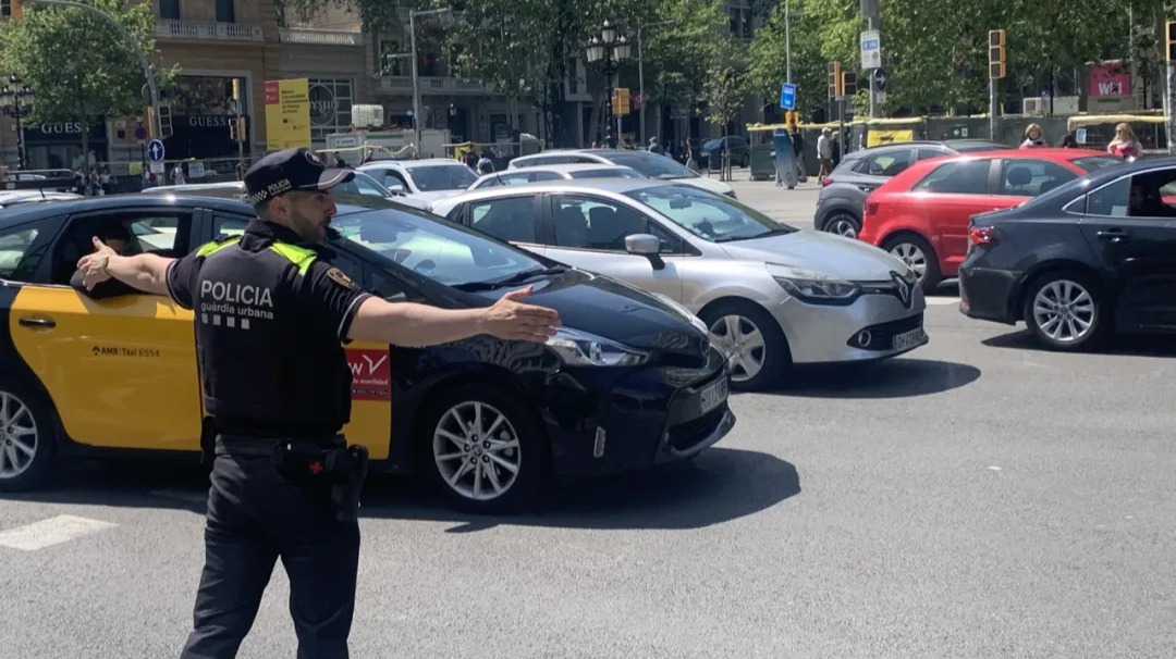 在巴塞罗那最市中心的加泰隆尼亚议会大道(Gran Vía)和感恩大道(Passeig de Gràcia)十字路口,红绿灯停止工作,交警在维持交通,摄影/赖忆