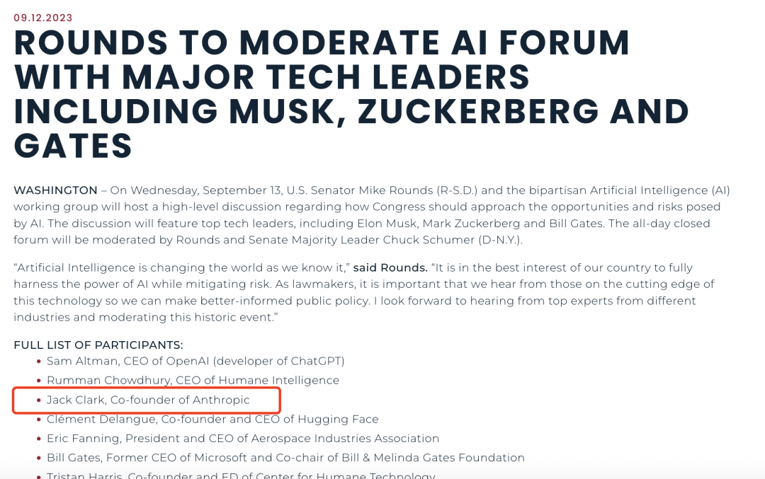 Jack Clark作为Anthropic联合创始人,出席参议院多数党领袖Chuck Schumer的闭门AI洞察论坛
