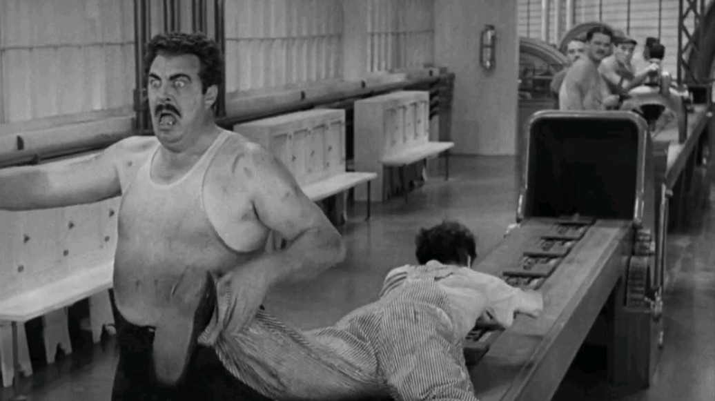 电影运用夸张的手法,表现了当时美国盛行的泰勒制和福特制生产方式。在这些生产制度下,工厂的工人需要一刻不停地完成一项简单却重复性劳动,并被无所不在的摄像头监控。而老板则是不顾实际盲目要求生产速度,想方设法挤压员工休息时间。