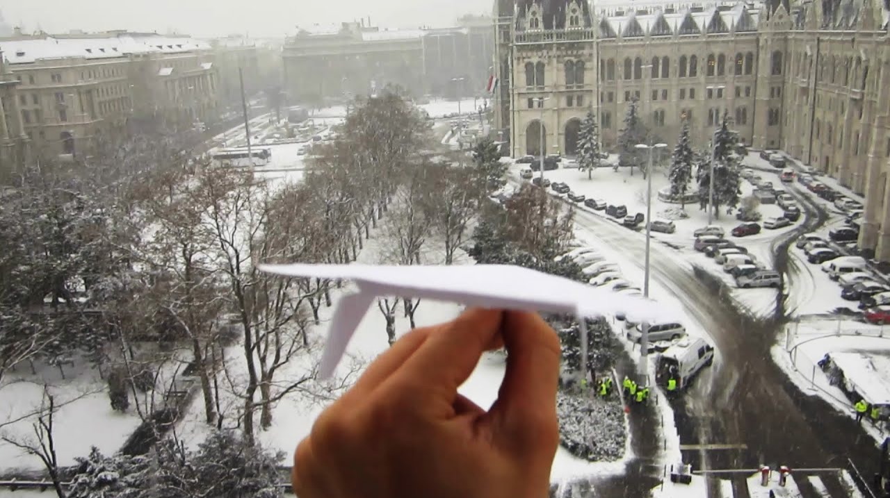 下雪天,我测试折的纸飞机能滑多远。楼下正好有电车开过,纸飞机差点撞上,但在最后一刻,纸飞机被风和雪带跑,降落在了车顶上。:)