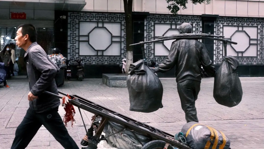 这是独属于武汉汉正街的景象。汉正街位于武汉市汉口的繁华地带,是湖北最大的服装批发市场。上世纪90年代初,经商热潮兴起,仅1.67平方公里的汉正街凭借60多个专业市场和150万吨年货物吞吐量,成为华中地区最大商品集散地。汉正街的老街窄巷多达198条,宽度仅有三到四米,人力挑夫扁担便成为输送往来货流的主力军,挑起了汉正街的营生。时过境迁,人力拖车接替了扁担,接着又被电动拖车取代,不变的,是街巷里往返穿梭、忙碌奔走的身影。