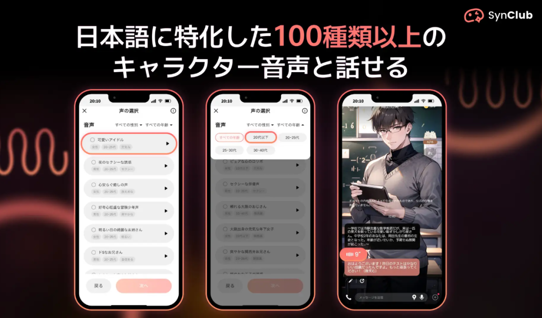 声音体验上的深度本地化。虽然 AI 语音已成为主流社交产品的标配,但“SynClub”的语音系统明显更为细腻,其为日本市场专门制作了 100 多种声音选项,涵盖不同年龄层、性格特征乃至方言(如关西腔),并在每次进入对话时自动播放背景音乐,显著提升了沉浸感;