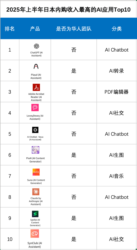 2025 年上半年,日本 AI 应用市场呈现出一个鲜明特征,用户规模不大,但付费能力极强。