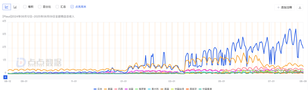 点点数据显示,“Plaud”7 月收入在 100 万美元这一量级,Sensor Tower 抓取到的数字更大,达到了 260 万美元,据此预估上半年的收入将轻松超过千万美元,而日本正是“Plaud”最重要的收入来源国。