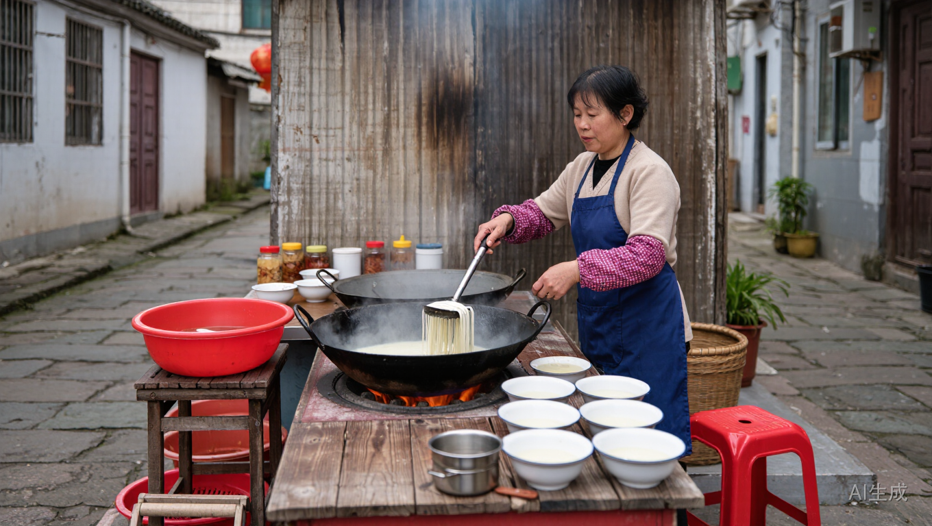 那摊子支在巷口转角,仿佛天生就长在那里。十多年了,巷子里的店铺招牌换了又换,唯有那口熬汤的大锅风雨无阻地蹲守着。锅是口粗黑厚重的生铁锅,日子久了,锅沿被汤气熏得油亮发乌,像糊上了一层深褐的釉。炉火终日舔着锅底,白汽便从锅盖边缘噗噗地钻出来,扭动着升腾,执着地缠绕着巷口那棵老樟树不肯散去。