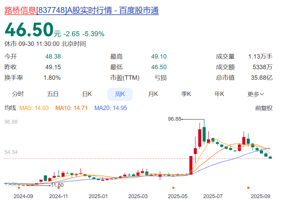 9月30日,路桥信息股价大跌,截至中午收盘已跌超5%。值得注意的是,该公司股价年内经历大起大落,曾在5月末一周暴涨超90%,至6月下旬一度涨至96.88元,较年初的19.42元涨幅近400%。随后震荡下滑至50元上下。即便如此,该公司年内股价涨幅仍超过130%。