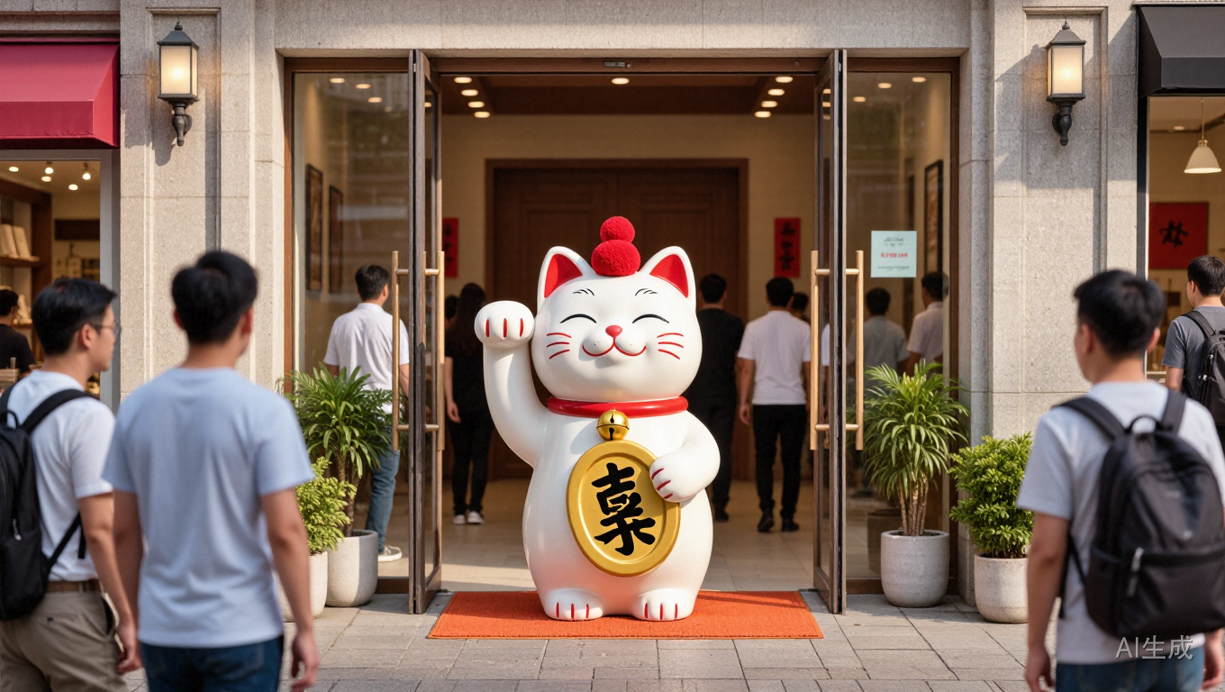 作为日本传统民俗最受欢迎的吉祥物,招财猫辟邪招福,其肢体语言流露出精妙的商业智慧。它扬起左爪,纳客迎宾,诚邀四方宾客步入店铺。当右爪抬起时,则启动招财模式。更值得玩味的是,招财猫脖子上的铃铛,这枚看似装饰的物件实为驱邪法器,铃铛清脆的声响可以驱散厄运,营造出和谐的气场。