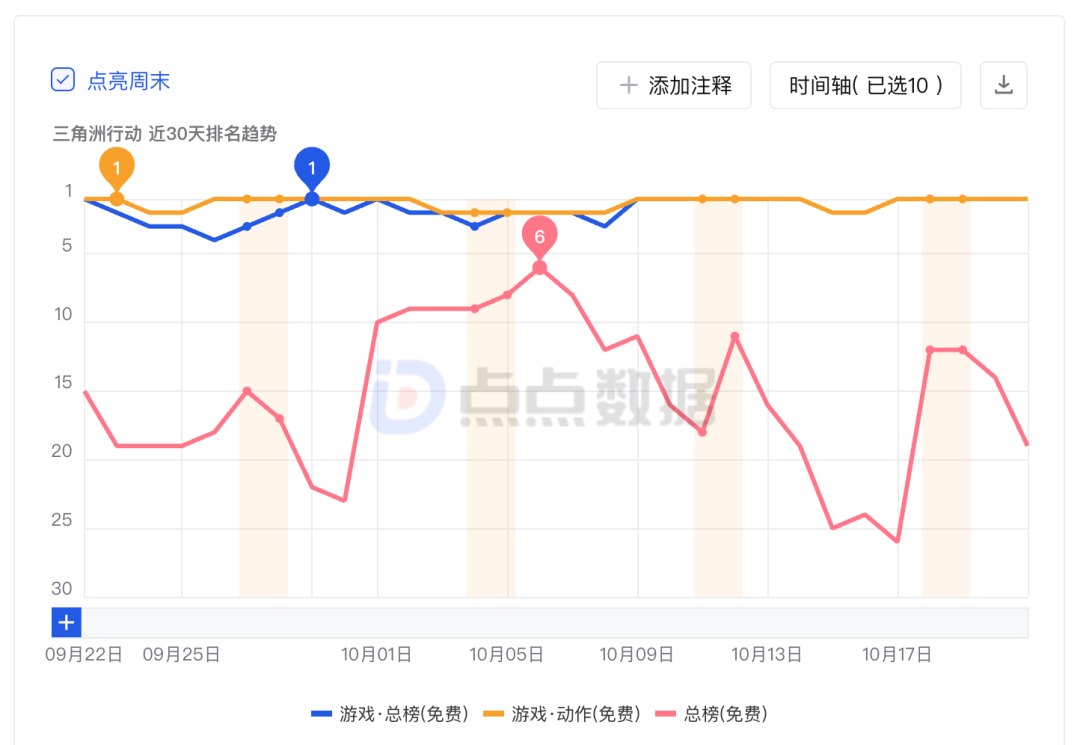 尽管官方服软,但玩家的信任裂痕已然出现。根据点点数据平台统计,10月6日(即调整公告发布次日)《三角洲行动》在iOS免费榜攀升至近30天最高的第6名,但此后排名持续下跌,到10月17日跌至免费榜第26位,目前虽有回升,但仍在20名左右。