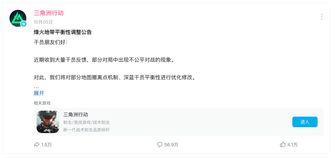 然而,这一现象引起了官方的注意。不久前,《三角洲行动》项目组突然发布公告,以“部分对局中出现不公平对战现象”为由,对潮汐监狱等地图的撤离点机制和“深蓝”干员进行了重大调整,试图弱化甚至禁止“共享监狱”的玩法。