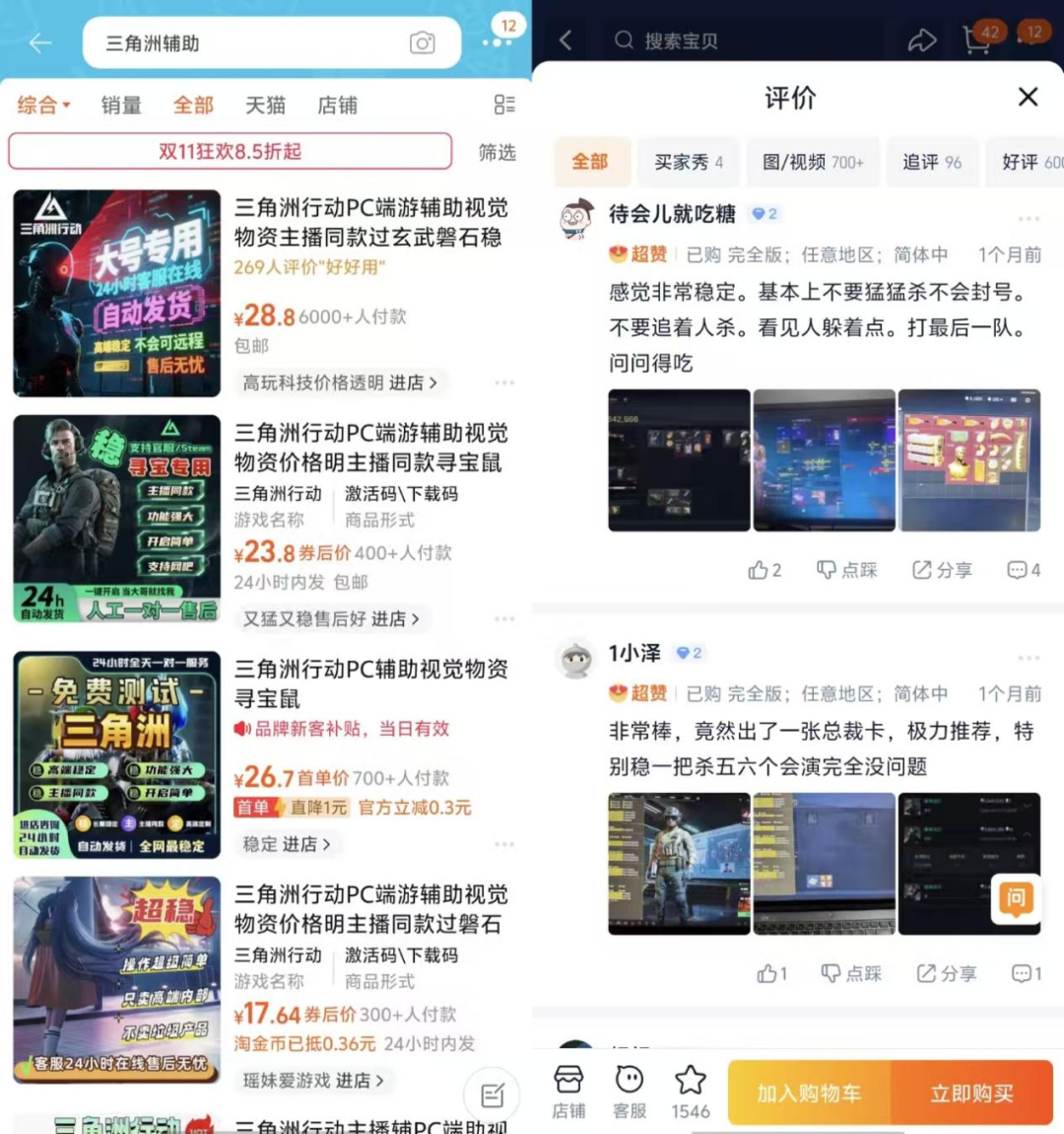 其中,不少店铺月销量过千单,甚至有店铺月销量达6000单,即便按最低18元售价计算,月收入也有数万元之多。更令人担忧的是,在百度上搜索“三角洲+透视”“三角洲+辅助”,会出现大量外挂网站,甚至部分卖家外挂可实现“跨端兼容”,即在PC、安卓、iOS三端运行,有店主称“三端运行秒授权,无需繁琐操作”,还有店主向《BUG》栏目表示,许多代练工作室也在使用他们的外挂。