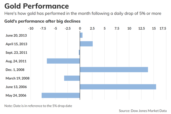道琼斯市场数据公司(Dow Jones Market Data)对最活跃的黄金期货进行的分析显示, 自2006年5月24日以来,黄金期货在经历5%或更大的单日跌幅后,一个月内平均涨幅约为1.82% 。