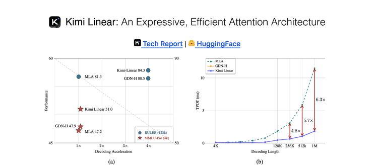 周昕宇的评论显然有所指,但“got your back”究竟是什么意思?答案在24小时后揭晓。10月30日,月之暗面发布了Kimi Linear,一个48B参数的混合注意力模型,声称在长上下文任务中KV Cache减少75%,吞吐量提升6倍。