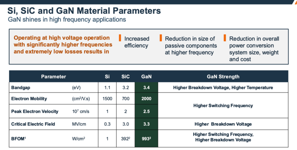 最后,应用也相当重要。安森美认为vGaN可以充分满足当前市场需求,能够满足AI数据中心对于提升计算密度的需求、满足EV延长续航和快充的需求、满足可再生能源降本增效的需求,并解决传统材料(Si、SiC)在效率与尺寸上的瓶颈,通过对比来看,GaN本身的材料属性,便可天生应对高频的应用: