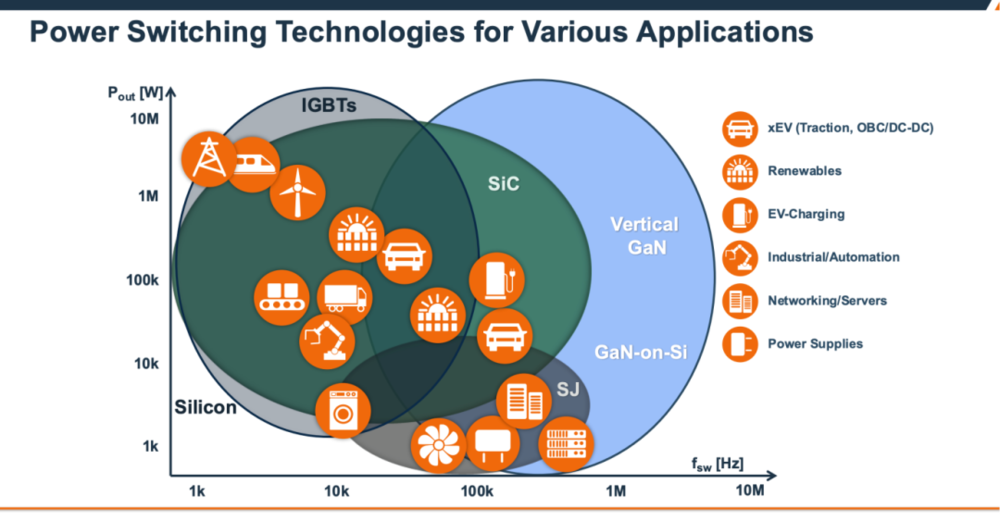 当然,随着GaN能够逐渐应对一些大功率的场景,那么它该和SiC怎么分配。安森美作为一家深耕SiC的公司也给出了答案——IGBT、SiC、SJ、vGaN这些技术有重合,但也有属于自己的擅长领域: