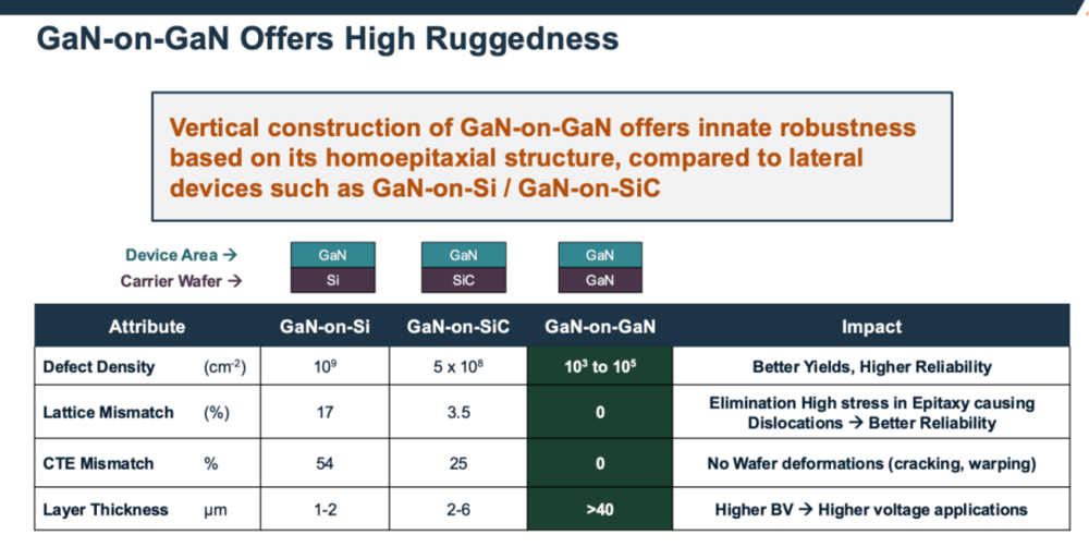 安森美vGaN选择采用了GaN-on-GaN同质外延结构。安森美还放出了一张PPT,展示了GaN-on-GaN的优势: