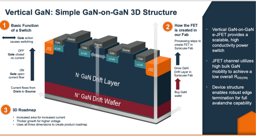 其次,器件的实现也是vGaN的重要课题。根据其PPT显示,安森美选择采用e-JFET(结型场效应晶体管)的器件形式,提供可扩展、高导电功率开关,实现了较低的整体导通电阻RDS(ON),具备完整的雪崩能力。