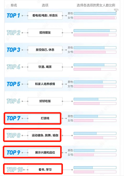 在满足基本的需求上,年轻人多了自己的兴趣爱好, 打游戏、运动健身、跳舞、看书学习等
