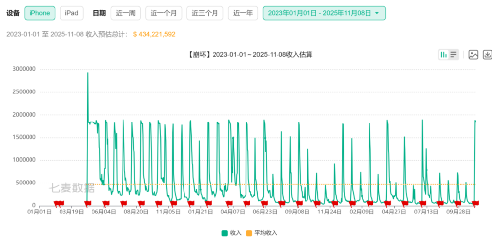 据七麦数据,自2023年1月1日以来,米哈游旗下《原神》以及《崩坏:星穹铁道》两大核心游戏产品,其iOS端下载量及收入预估,均出现了不同程度的下滑——高增长频率周期不断拉长,整体趋势向下。