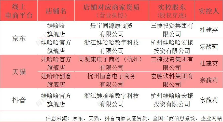 目前,天猫、京东、抖音平台上娃哈哈的官方店铺均统一为“娃哈哈官方旗舰店”,其官方旗舰店对应的商家资质统一为杭州恒意电子商务有限公司,股权穿透后的实控股东为宏胜饮料集团有限公司,实控人为宗馥莉。