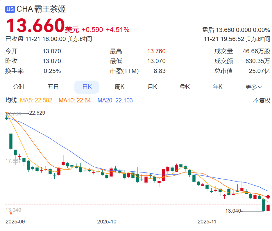 11月21日,霸王茶姬股价大涨,截至收盘涨4.51%,总市值25.07亿美元(约合人民币178亿元)。与此同时,天合光能股价却迎来三连跌,截至收盘跌超5%,总市值425.18亿元。