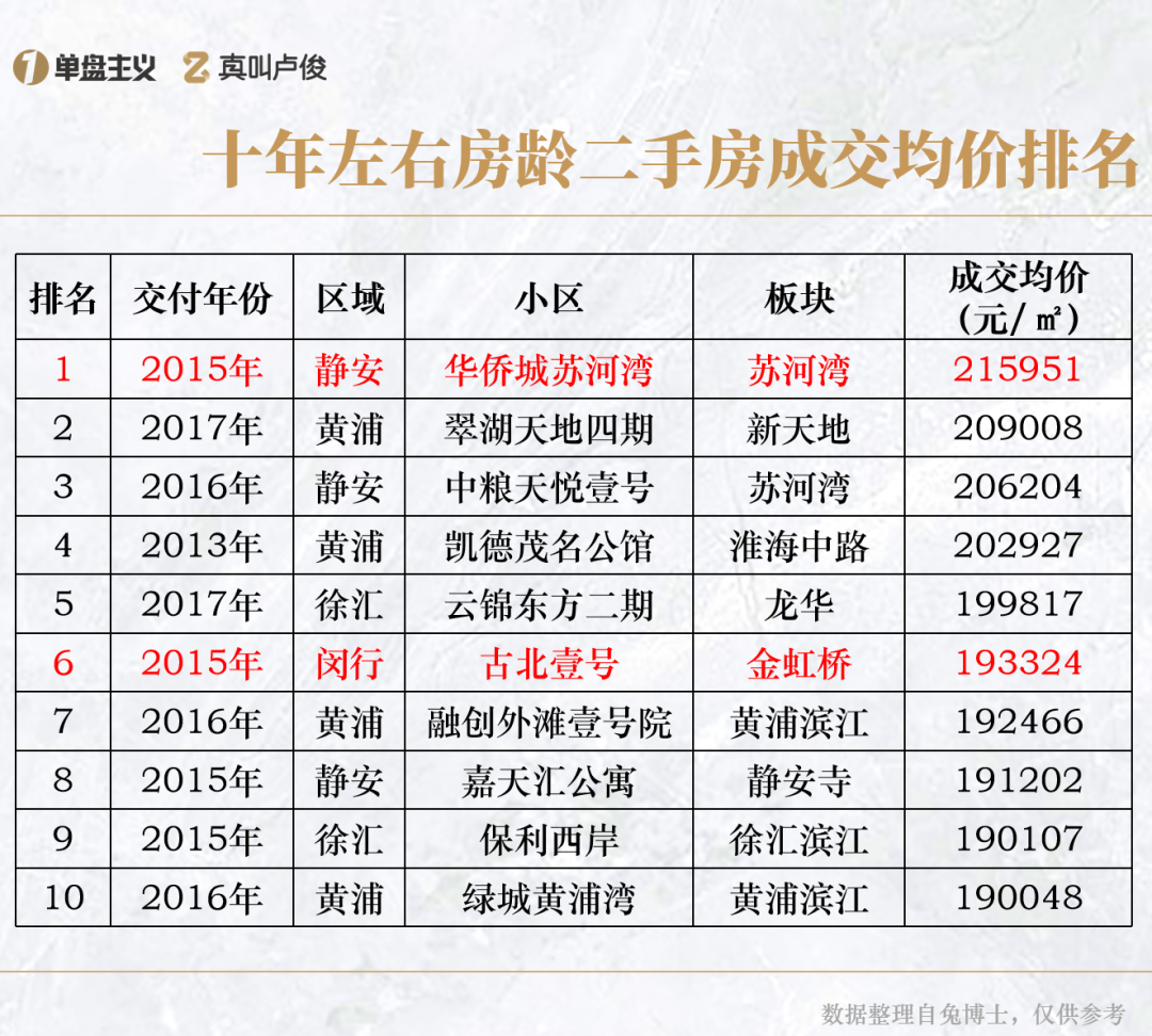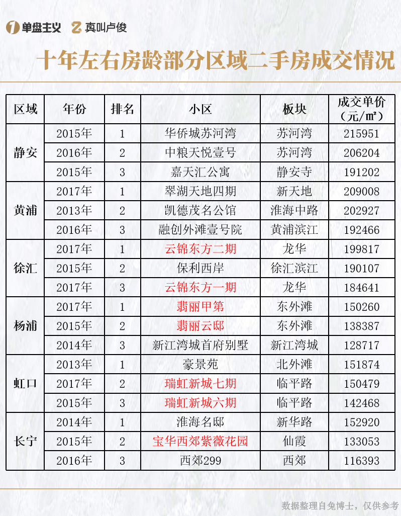 我们整理了今年各个区乃至各个板块,十年左右房龄的二手房成交情况,试着从这些楼盘中找到成交单价最高的是哪些