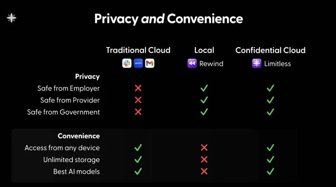 Limitless首发的隐私云,则能做到平衡二者关系,在保证云端服务的前提下,把所有个人资料的查看、揭秘全都留在了本地,只有个人认证后,私人数据才能被浏览。