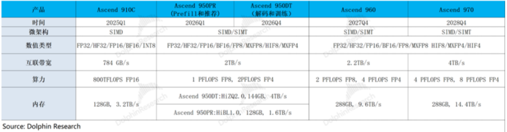 在路线图演进上能看到和H200竞争的,要等到华为下一代950芯片(适用于FP8),它会是首款能用到训练上,同时内存配置、卡间互联和集群能力都比较强的国产芯片。