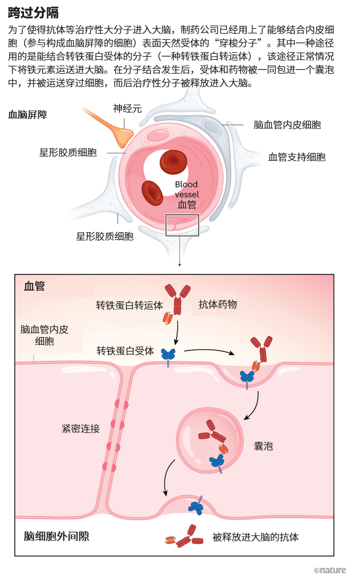 凭借足够发达的蛋白质工程技术,通过将生物制剂连接至靶向某一受体的分子构建体上,几乎所有的治疗性生物制剂都能够以与转铁蛋白相同的方式穿过屏障,Bonni说。该构建体通常包含用以结合受体的抗体分子的一小部分。