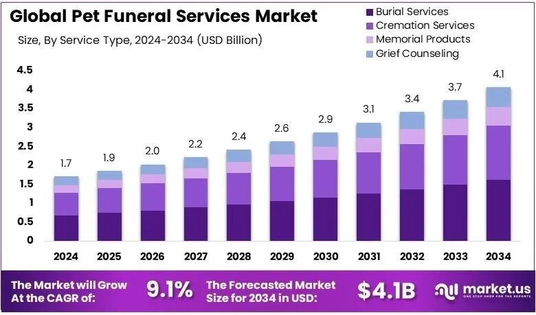 根据Market.us报告数据显示,全球宠物殡葬服务市场规模预计25年约为21.8亿美元,到2030年,这个数字将进一步增长至37.5亿美元。而根据大数跨境预测,到2034年将突破41亿美元,其中,北美、欧洲、亚太(中国、日本、韩国)地区是核心增长市场。