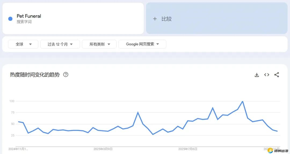 从谷歌趋势数据看,有关“Pet Funeral”一词在过去12个月内搜索热度阶段性浮动上升,最高曾达到100,进入25年,更是热度涨幅最明显的一年。